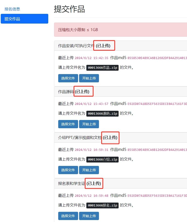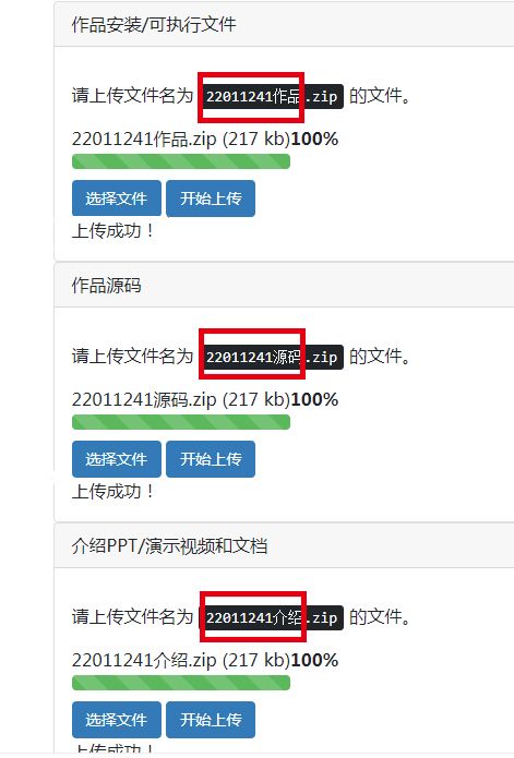 2、将“作品安装/可执行文件”,“作品源码”,“作品ppt/演示视频和文档”,“报名表和学生证”四项分别打包压缩,单项文件不能超过1G,并将文件名改为页面中提示的名字,如下图红框所示(每个参赛团队的命名编码不同),上传至相应位置。